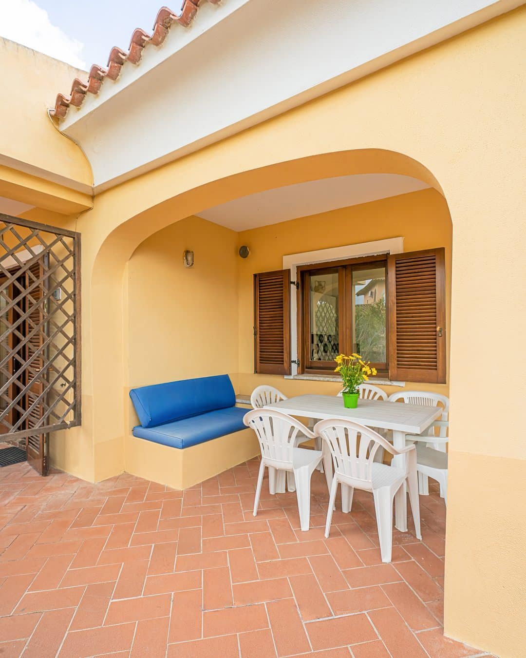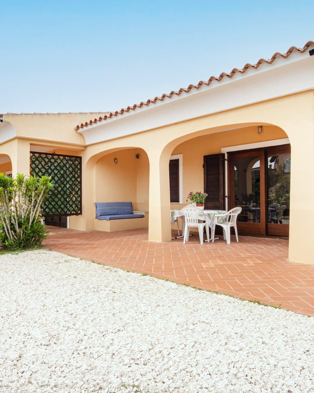 Giardino e veranda attrezzati con tavolo e sedie da giardino