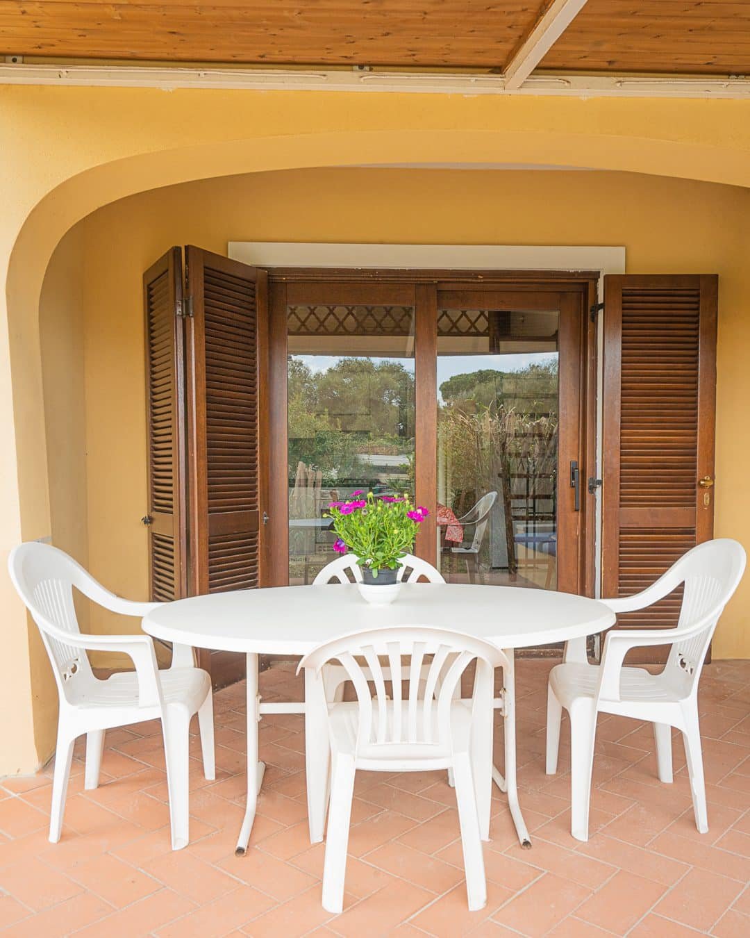 Giardino e veranda attrezzati con tavolo e sedie da giardino